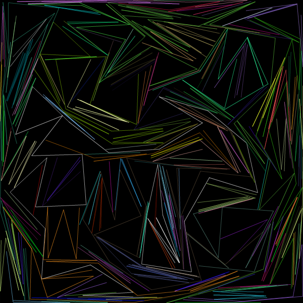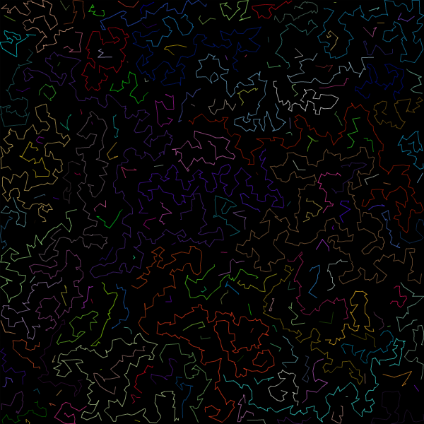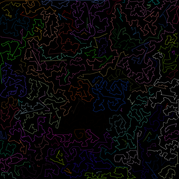 Here’s the idea: Create 5000 points. Choose one at random. Draw a line from it, to the next nearest point. Continue to do that, without crossing any previously drawn lines. When it’s impossible to draw another line, choose another point and another color and start over. The result is all these different colored squiggles that never cross themselves or each other. It looks a lot like Brownian motion trails, but really has no relation.
