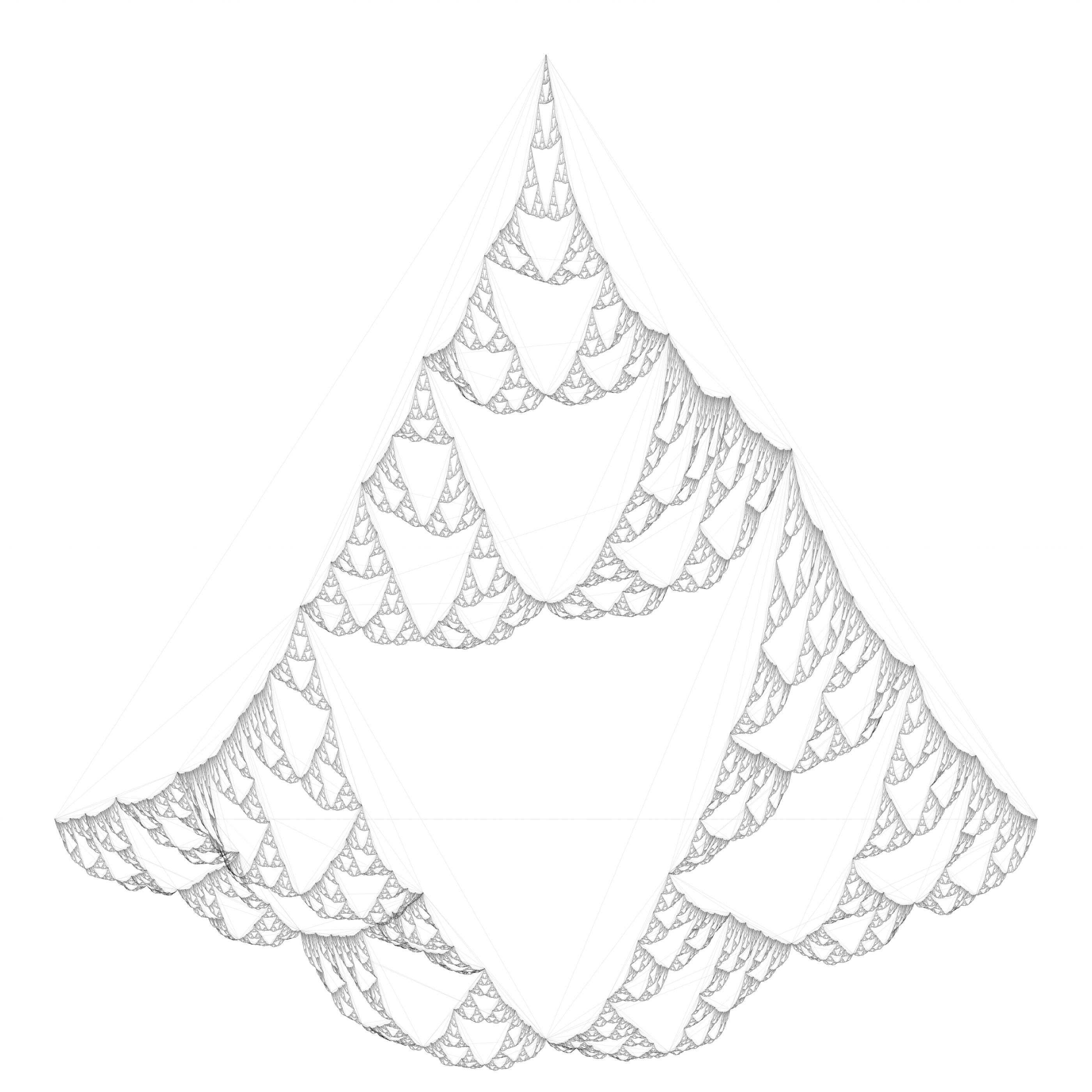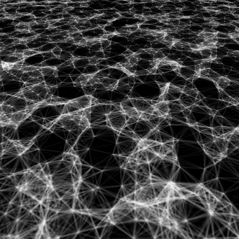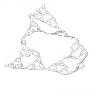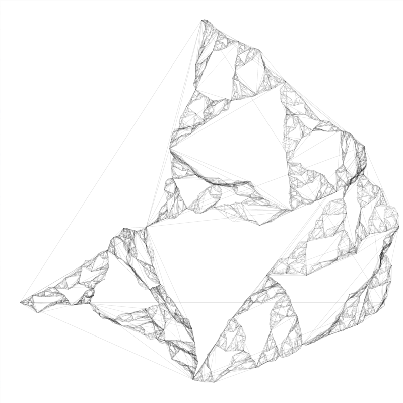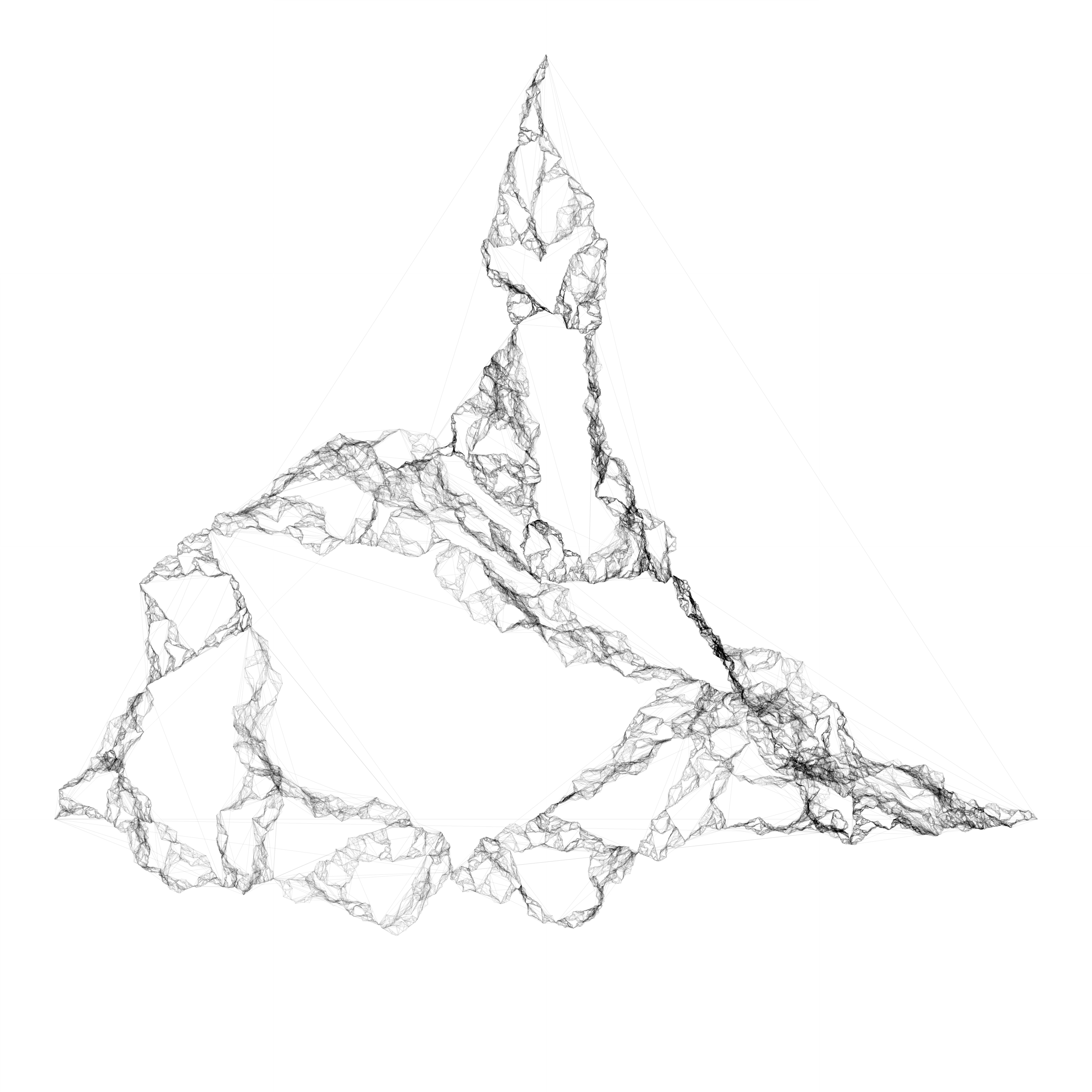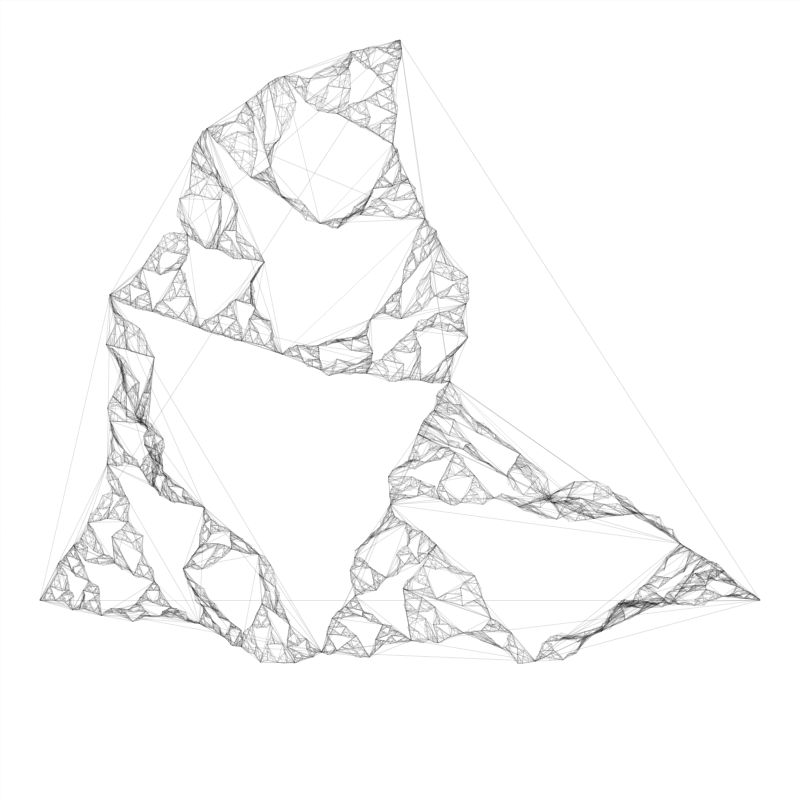 Read more...Here’s the idea: Create 5000 points. Choose one at random. Draw a line from it, to the next nearest point. Continue to do that, without crossing any previously drawn lines. When it’s impossible to draw another line, choose another point and another color and start over. The result is all these different colored squiggles that never cross themselves or each other. It looks a lot like Brownian motion trails, but really has no relation.