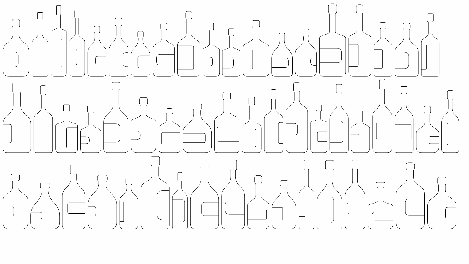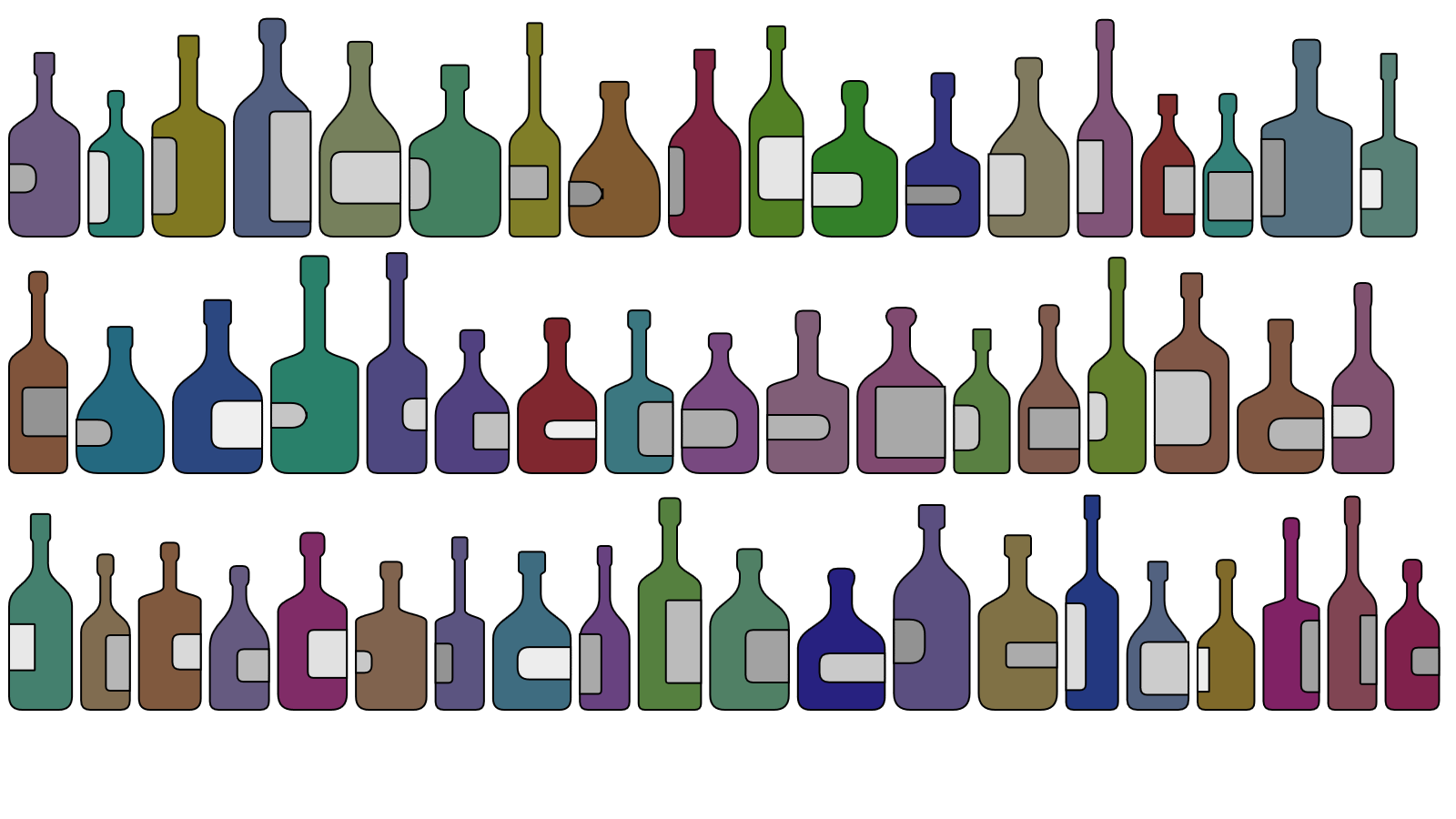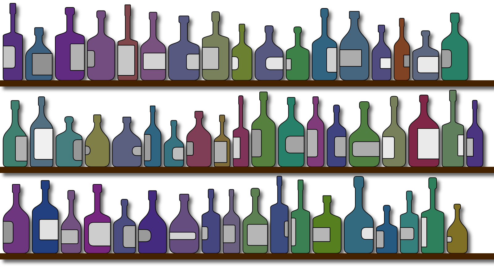 Each year, my wife and I try to go to Japan to visit her mother. We didn’t make it last year, but the previous year we spent a couple of weeks there and took a several day trip to Kouyasan and Nara City. I loved Nara – probably my favorite place in Japan so far. In the elevator of the hotel we stayed at were advertisements for the hotel restaurant and bar, like you’d see in any hotel elevator. The one for the bar had a hand-drawn  illustration of  a bunch of bottles on shelves.  I really liked the look of it and thought it would be a great to recreate as a generative art piece. I played around with a bit at the time, but never published anything on it.