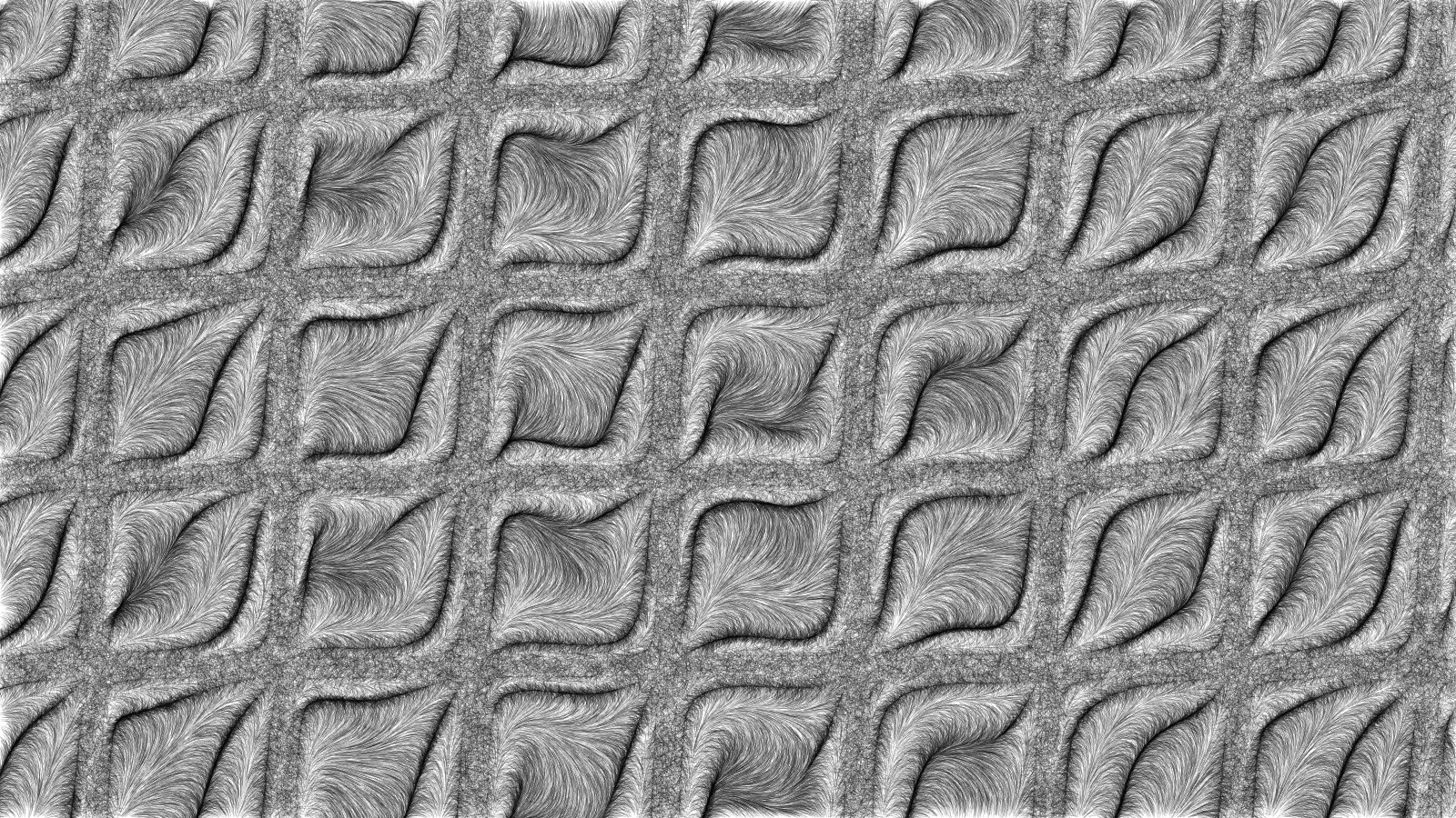 Same drawing algorithm, but uses a Perlin noise based flow field to determine initial angle.