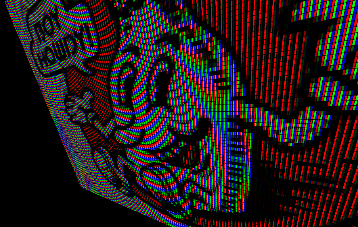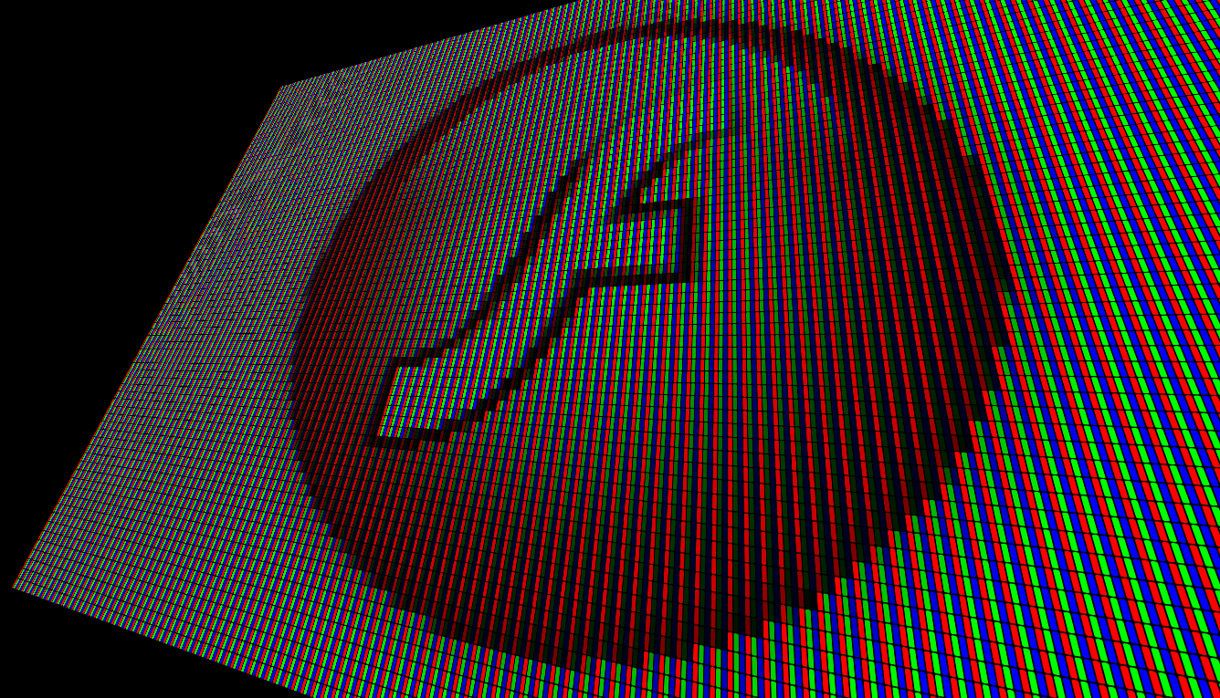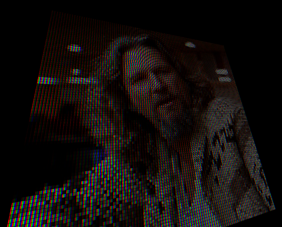 These are not photos of an LCD monitor. It’s an AS3 application. A picture is loaded in. Every nth pixel is sampled and a pseudo-pixel is drawn, each with a red, green, and blue bar. The whole thing can be rotated and positioned in 3D. Best seen full size, of course.